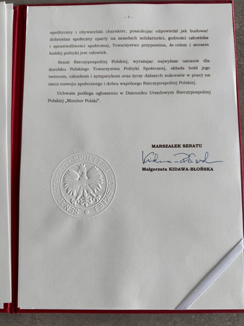 „Senat Rzeczypospolitej Polskiej, wyrażając najwyższe uznanie dla dorobku Polskiego Towarzystwa Polityki Społecznej, składa hołd jego twórcom, członkom i sympatykom oraz życzy dalszych sukcesów w pracy na rzecz rozwoju społecznego i dobra wspólnego Rzeczypospolitej Polskiej” – napisano m.in. w przyjętej uchwale.